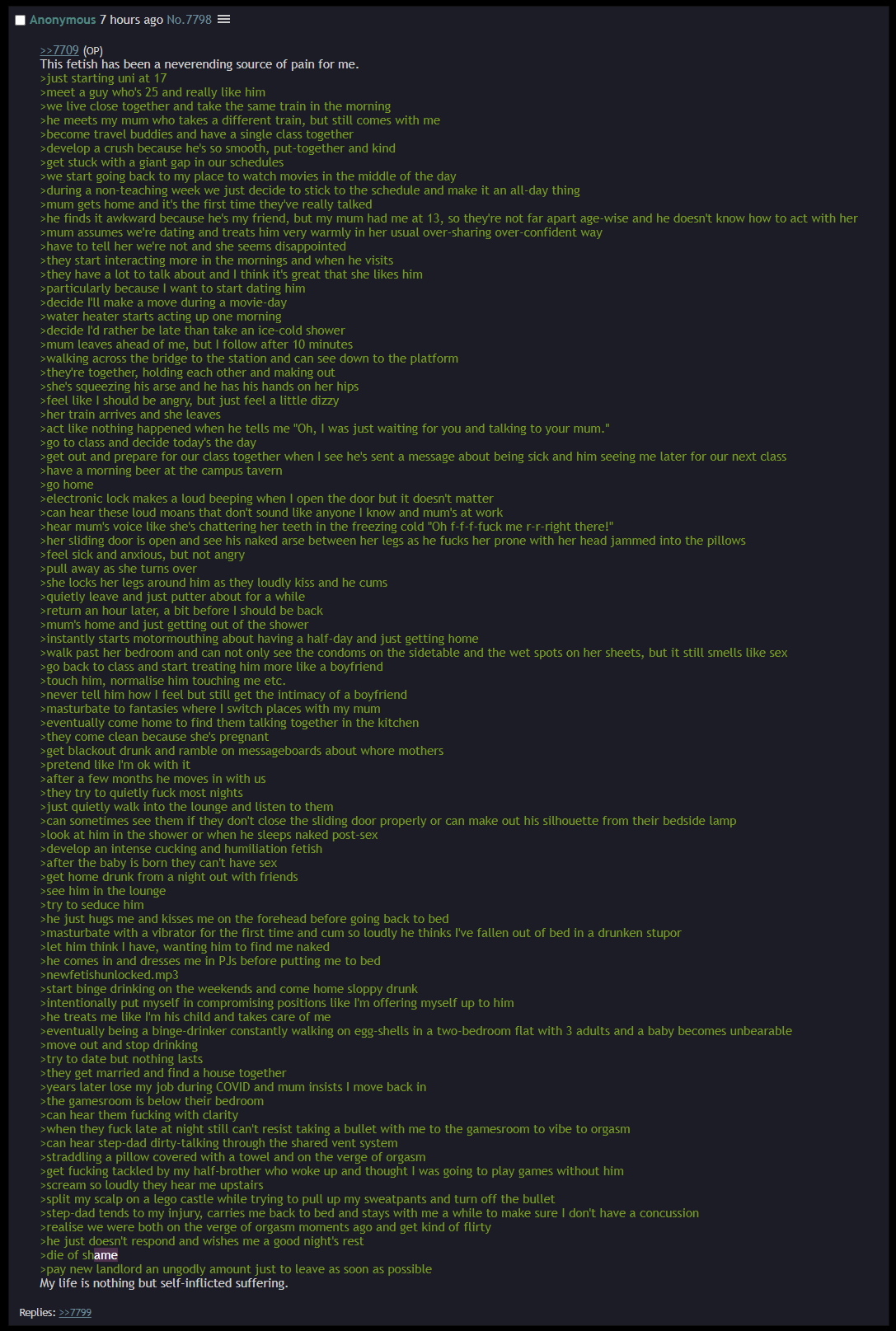 Imagine being a daughter of a total boobmonster, waiting for yours to grow in but they never do. Fed up with the chestlet life your mother has condemned you to, you decide that if she wont give you what should rightfully be yours, you will take what should rightfully be hers; you decide to seduce her husband. The whole endeavor turns out to be rather easy, after just a few weeks of hidden flirtation and stolen kisses you have him eating out of your hand. You guess that you must be a master seductress, or your mom isn't giving him enough attention in bed. You decide that it's time to really seal the deal, so after managing to get mom out of the house, you jump his bones. You're riding him raw, having a great fucking time, riding extra high off the fact that you're stealing him from her. He grabs both your hands and says "Honey, I'm getting close." Huh, that's kinda weird, why would he grab both your hands, and he always calls your mom honey... Suddenly, you feel feel hands on your hips holding you down as a massive pair of tits push into your back. "Silly girl. Did you think I didn't see what you were doing? If you wanted to get pregnant so your tits will finally sprout, you only needed to ask." You hear your dad moan, then feel his dick start to twitch as he shoots his load into you, all the while your mom is holding you down and making sure every drop lands inside you, voicing her encouragement to him the whole time. When he's done she removes her hands from your hips, then swats your butt lightly. "If that round didn't take, we can try again next week. Now move it, I'm going to clean your father up and our vixens don't get to be here for that part. Be sure to close the door on your way out, and don't forget that dinner is at 6." In a well-fucked stupor you meekly pad out of your parents' room, the sound of your mother sucking your juices off your dad's dick ringing in your ears.